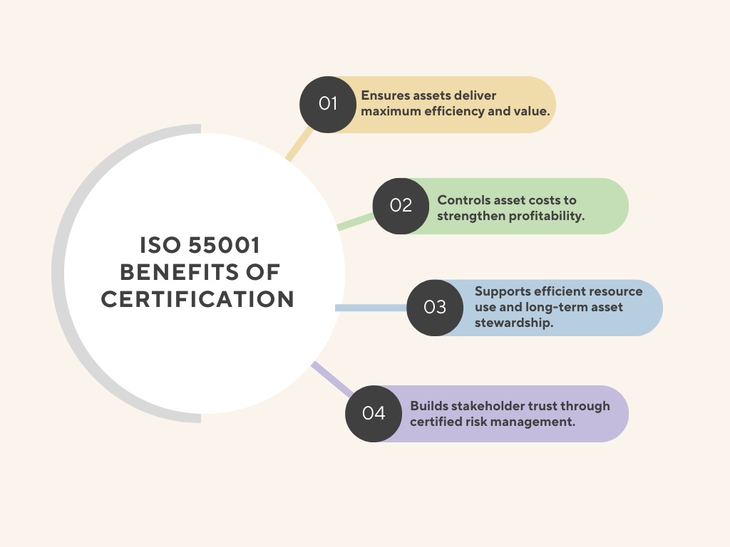 SO 55001 is important because it gives organizations a clear and structured approach to managing assets efficiently and sustainably. By following ISO 55001, businesses can better control asset lifecycles, balance performance with risk and cost, and maximize value. This standard helps reduce operational risks, improve decision-making, and enhance overall organizational performance and stakeholder confidence. ISO 55001 helps organizations: